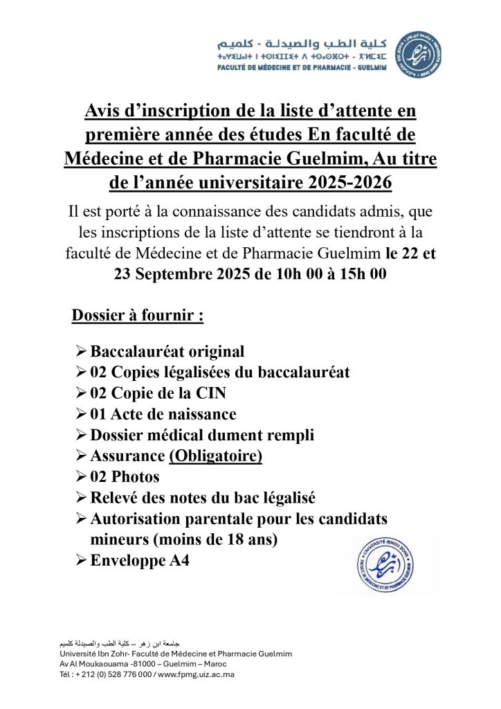 Avis d’inscription de la liste d’attente en première année des études En faculté de Médecine et de Pharmacie Guelmim, Au titre de l’année universitaire 2025-2026