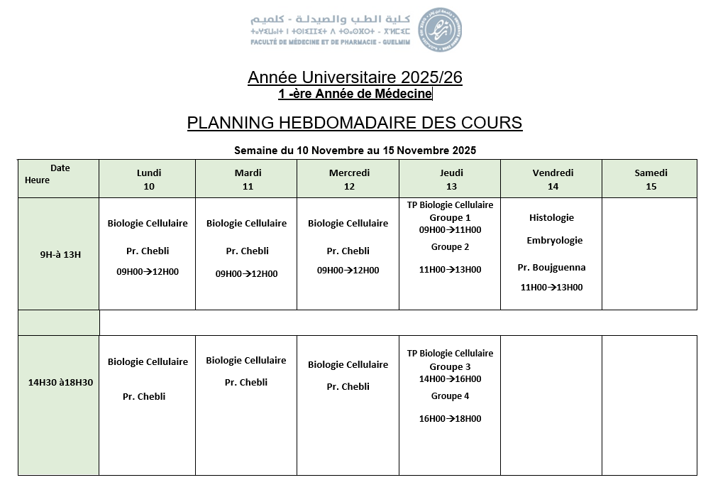 By administrator 9 novembre 2025 No Comments PLANNING HEBDOMADAIRE DES COURS S1 FMPG du 10 NOV au 15 NOV