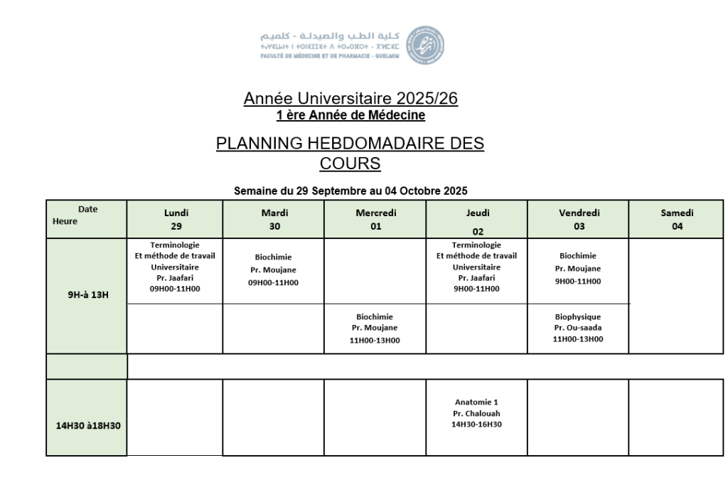 By administrator 26 septembre 2025 No Comments PLANNING HEBDOMADAIRE DES COURS S1 FMPG du 29 SEP au 04 OCT